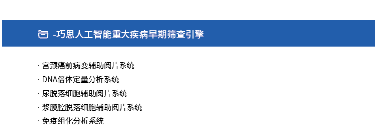 由多模态认知引擎(iDeepWise.ai)驱动的“深思考-巧思”是全球最早应用的人工智能病理细胞学重大疾病辅助阅片的产品,也是目前国内外唯一一款癌前病变零漏诊的产品,通过精准的阴阳分流和TBS分级功能,已大幅提升病理医生的诊断效率和准确率,2022年筛查人份超2000万人,深度落地于两癌筛查及医院的临床场景。