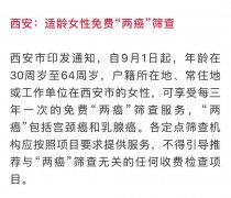 今日,西安市印发通知,自9月1日起,年龄在30周岁至64周岁,户籍所在地、常住地或者工作单位在西安市的女性,可享受每三年一次的免费两癌筛查服务。(人民网报道) 由此可见,国