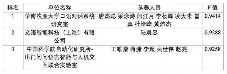 经过近五个月的筹备和角逐,共有7支队伍获得了奖项,其中华南农业大学口语对话系统研究室(scau_SIGSDS)团队获得了任务一封闭式和开放式两项的第一名,深思考人工智能(iDeepWise)获得任务二的第一名。