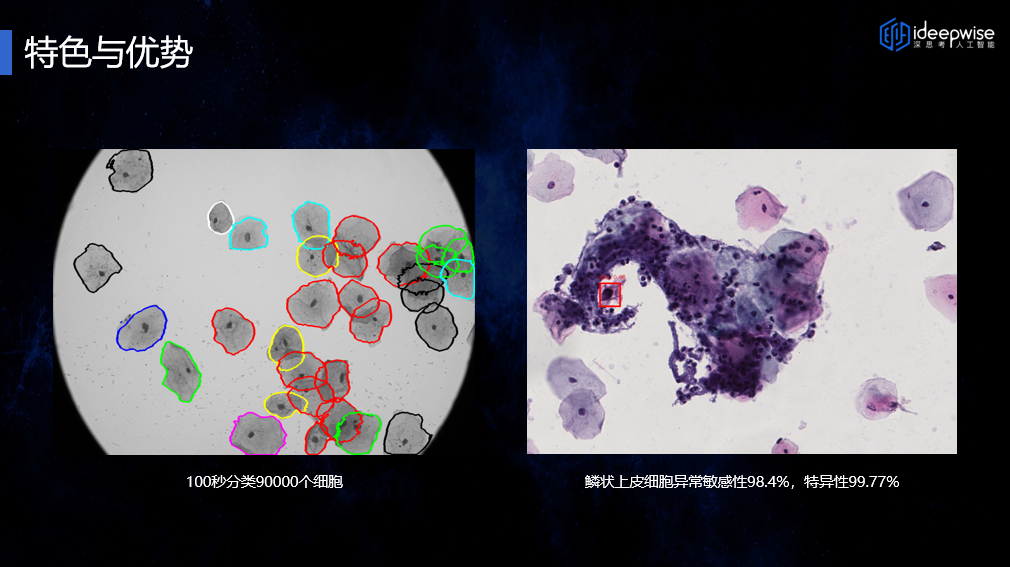 经过大量的测试结果显示,iDeepWise M-DPU 在 100 秒之内能够智能分类 90000 个细胞。而在 TCT(宫颈刮片)的应用上,iDeepWise M-DPU 加上其深思考自研的专用宫颈癌细胞识别算法给出了更为出色的成绩:鳞状上皮细胞异常检测敏感性达到 98.4%,特异性达到 99.77%,腺细胞异常监测敏感性达 93.4%,特异性逼近 99%,细胞类别分类精度达 99.3%,超过美国国立卫生研究院NIH。